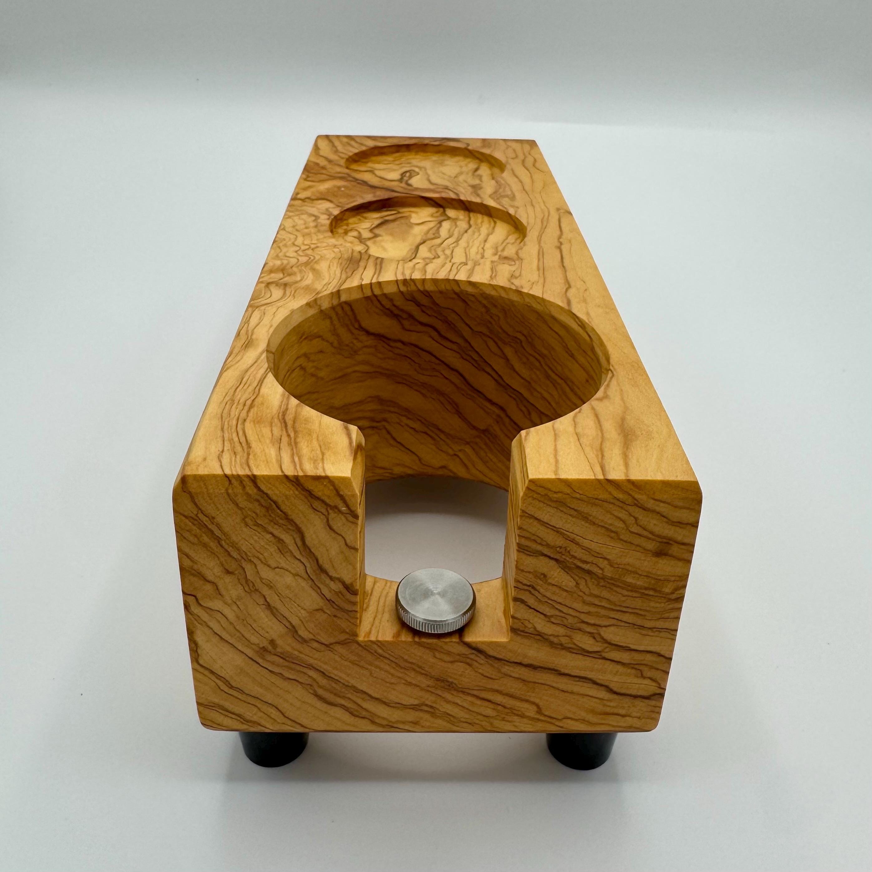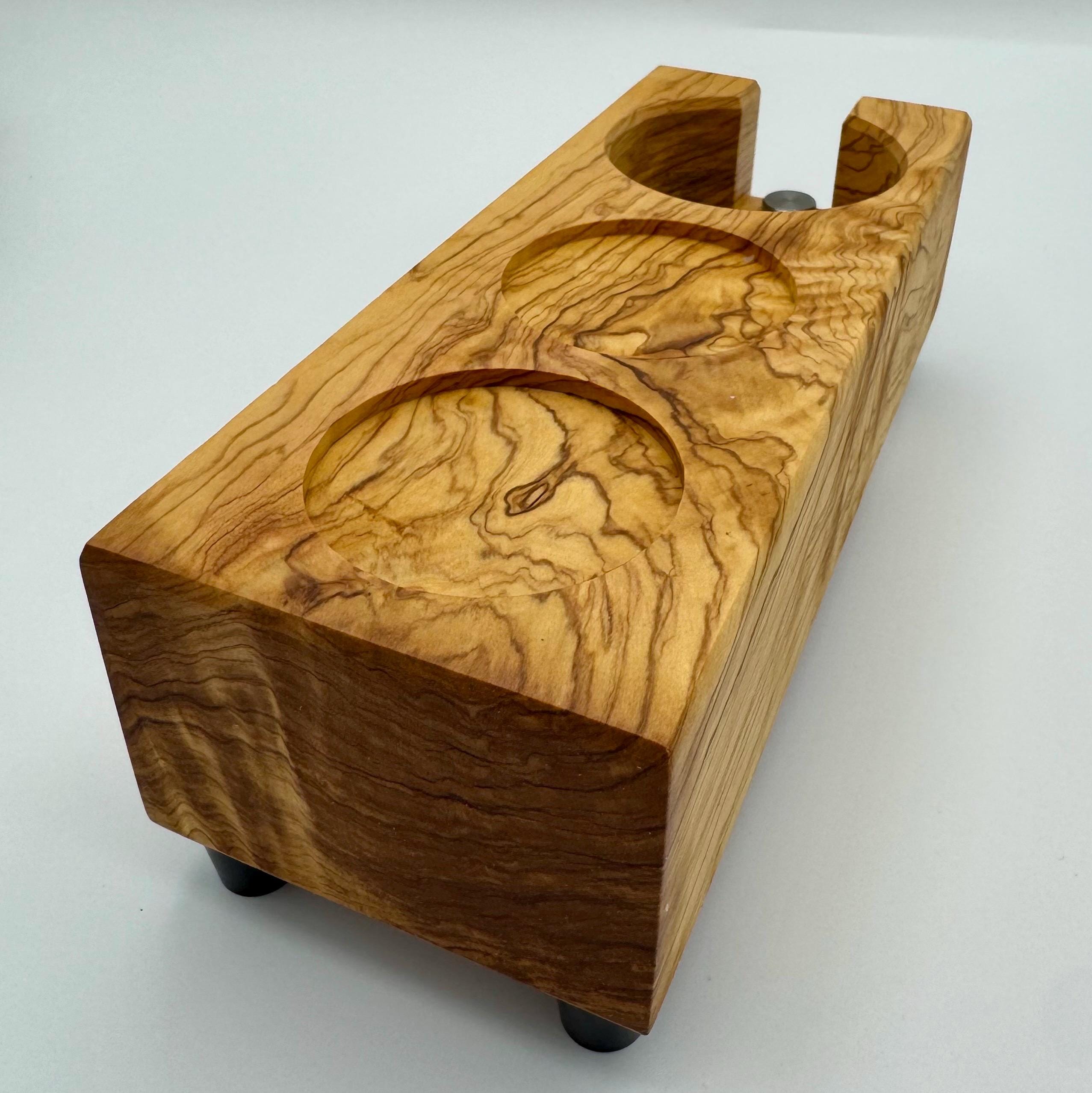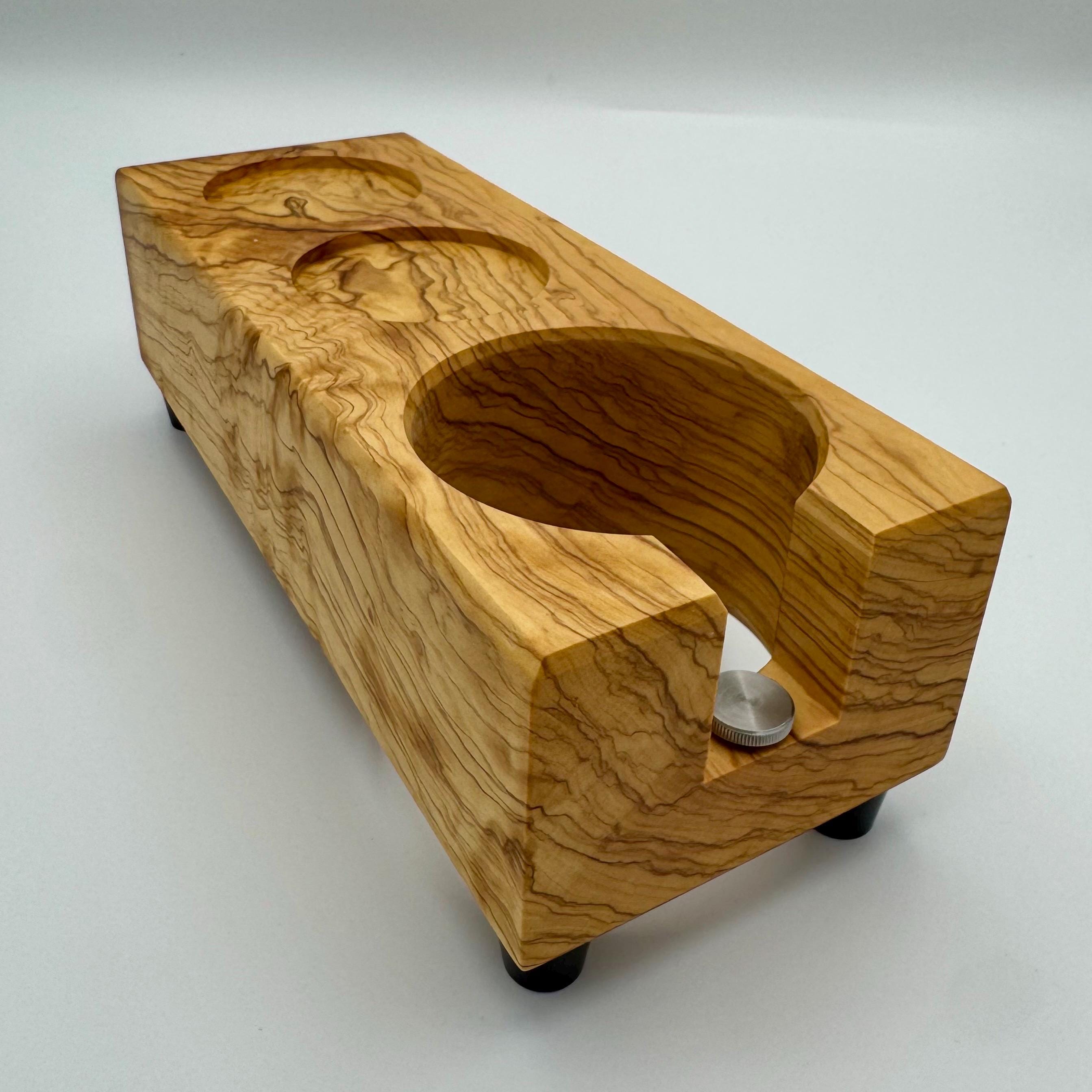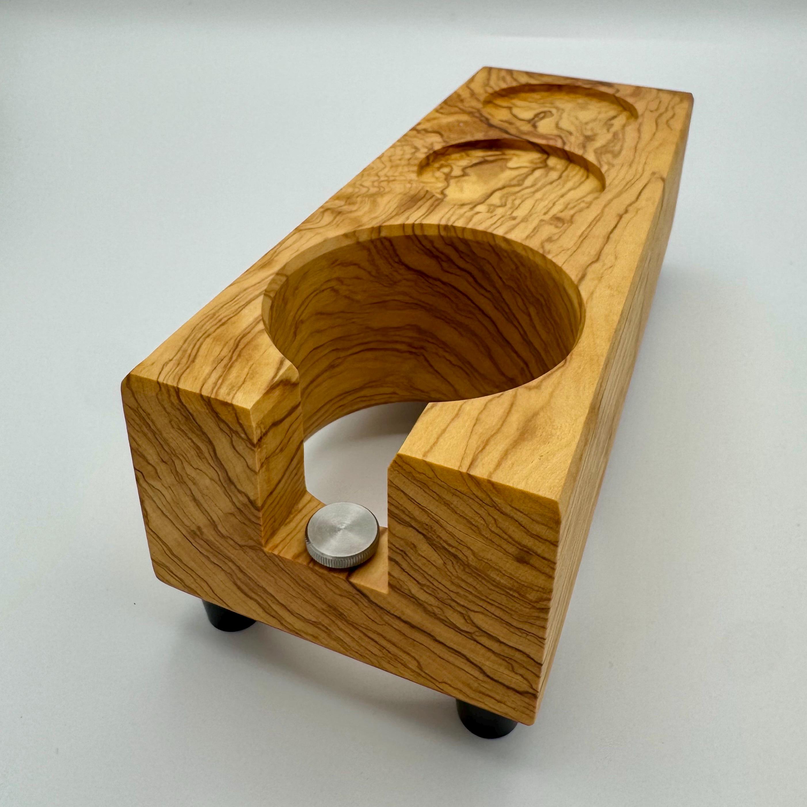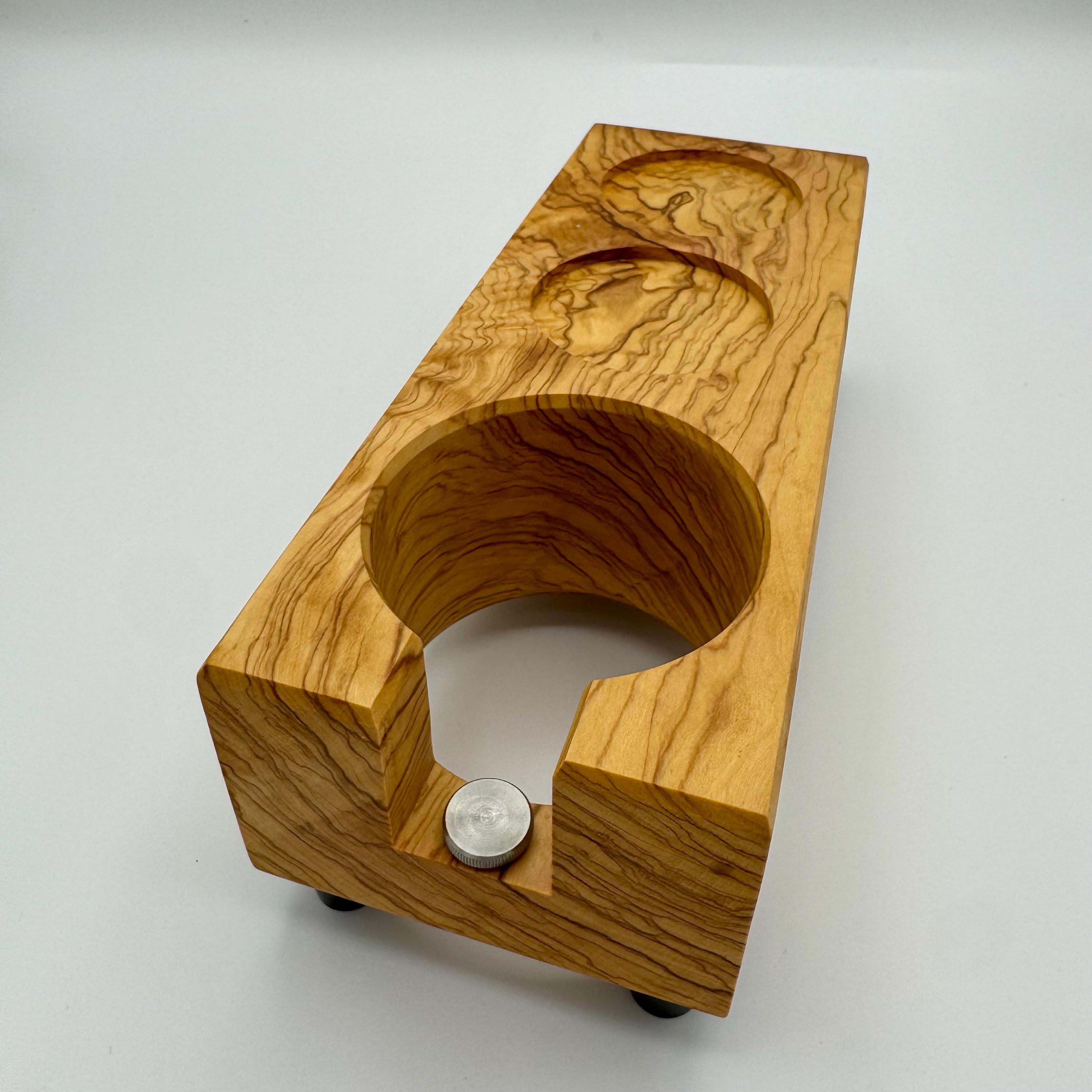 Diese handgefertigte Tampstation aus Olivenholz ist die erweiterte Version meiner Tampstation-Serie und bietet neben der sicheren Ablage für deinen Siebträger zwei zusätzliche Ablagen – ideal für Tamper und weiteres Barista-Zubehör.