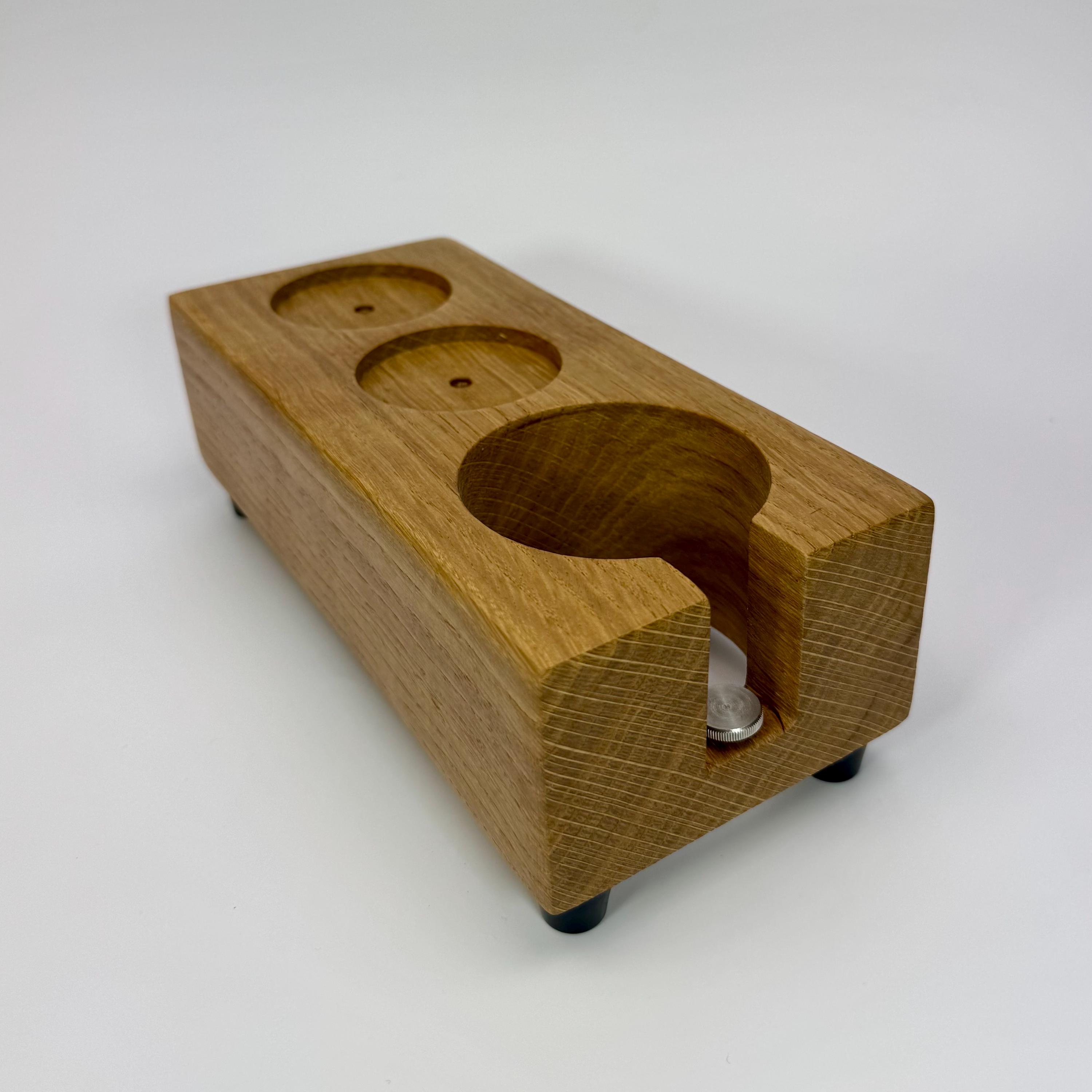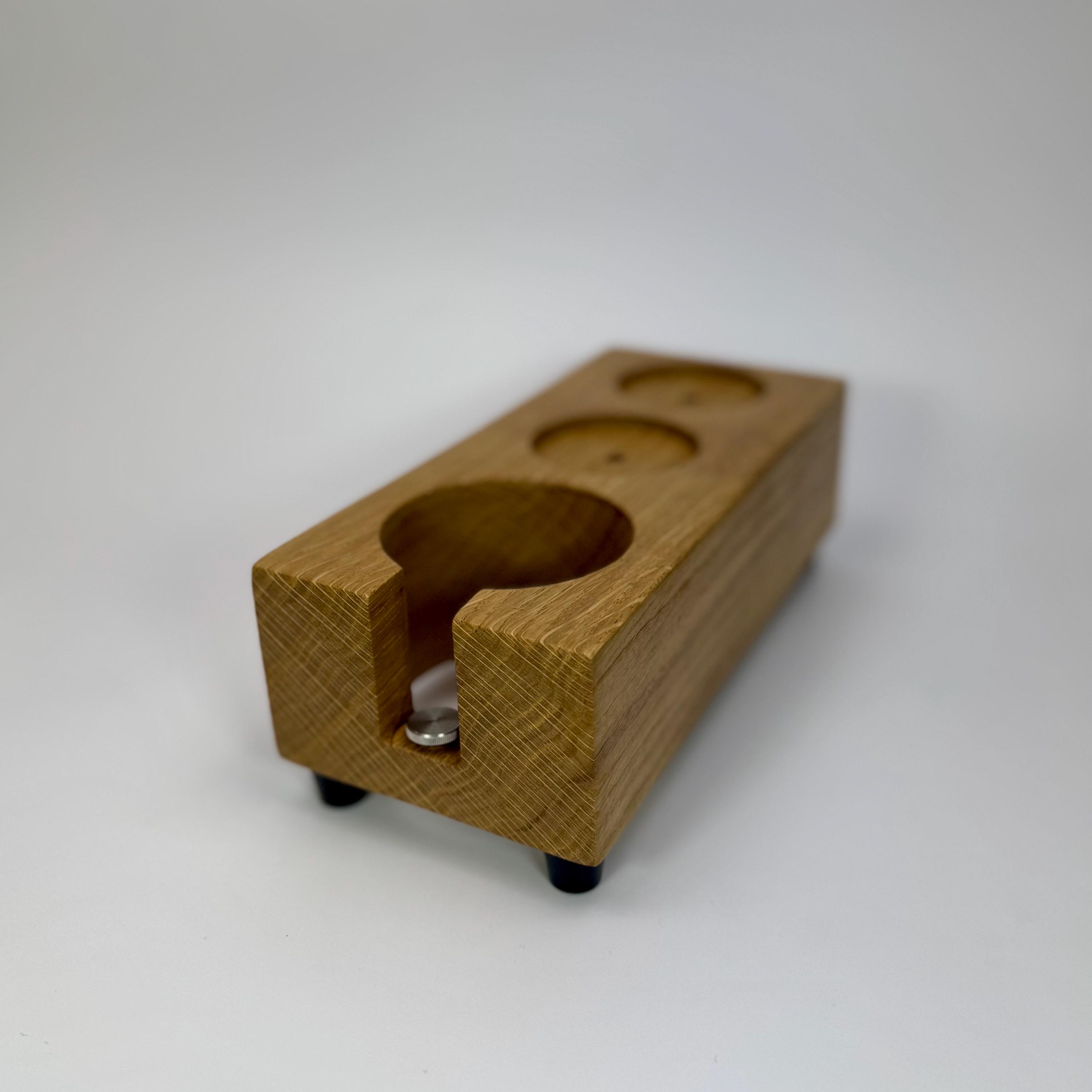 Diese handgefertigte Tampstation aus Eiche ist die erweiterte Version meiner Tampstation-Serie und bietet neben der sicheren Ablage für deinen Siebträger zwei zusätzliche Ablagen – ideal für Tamper und weiteres Barista-Zubehör.