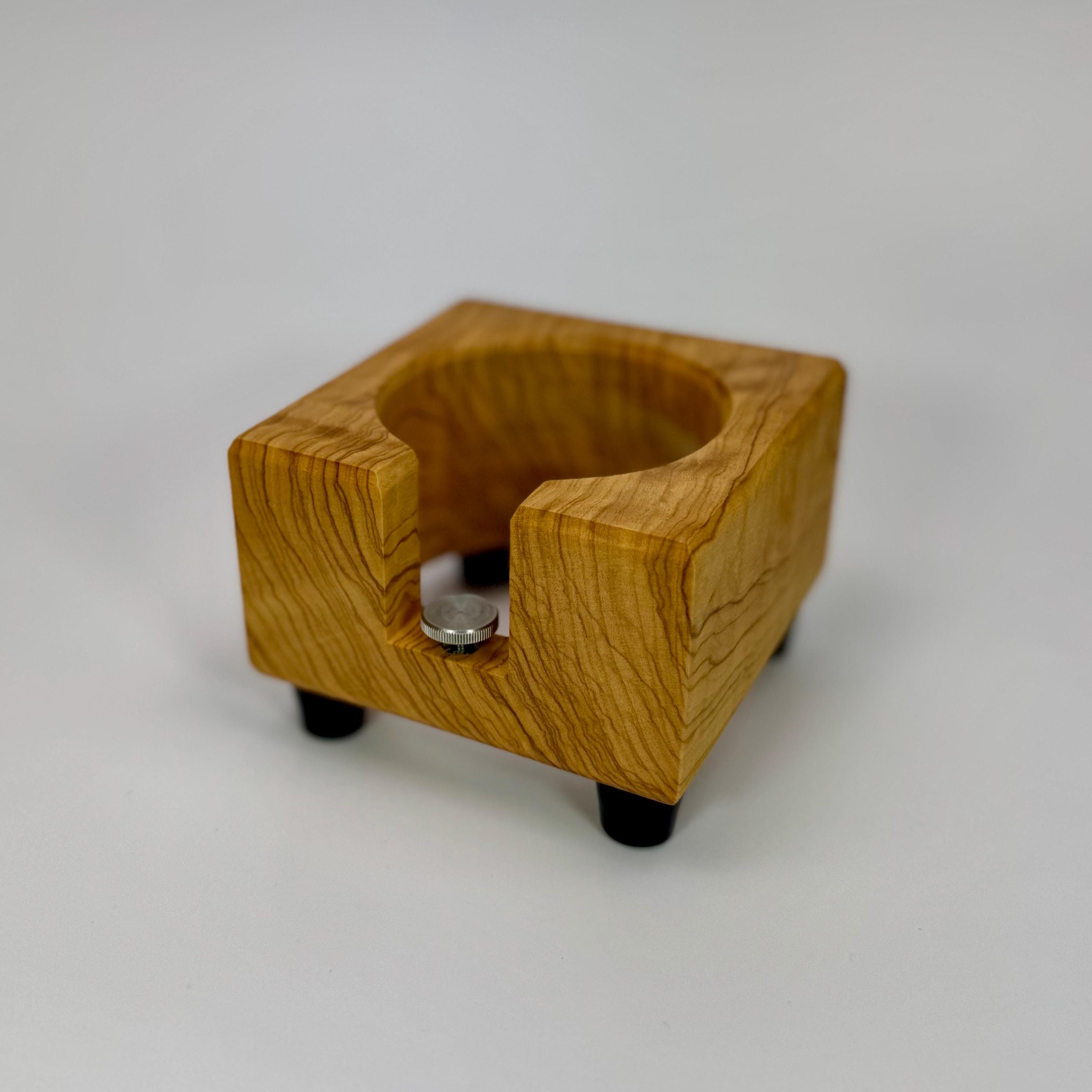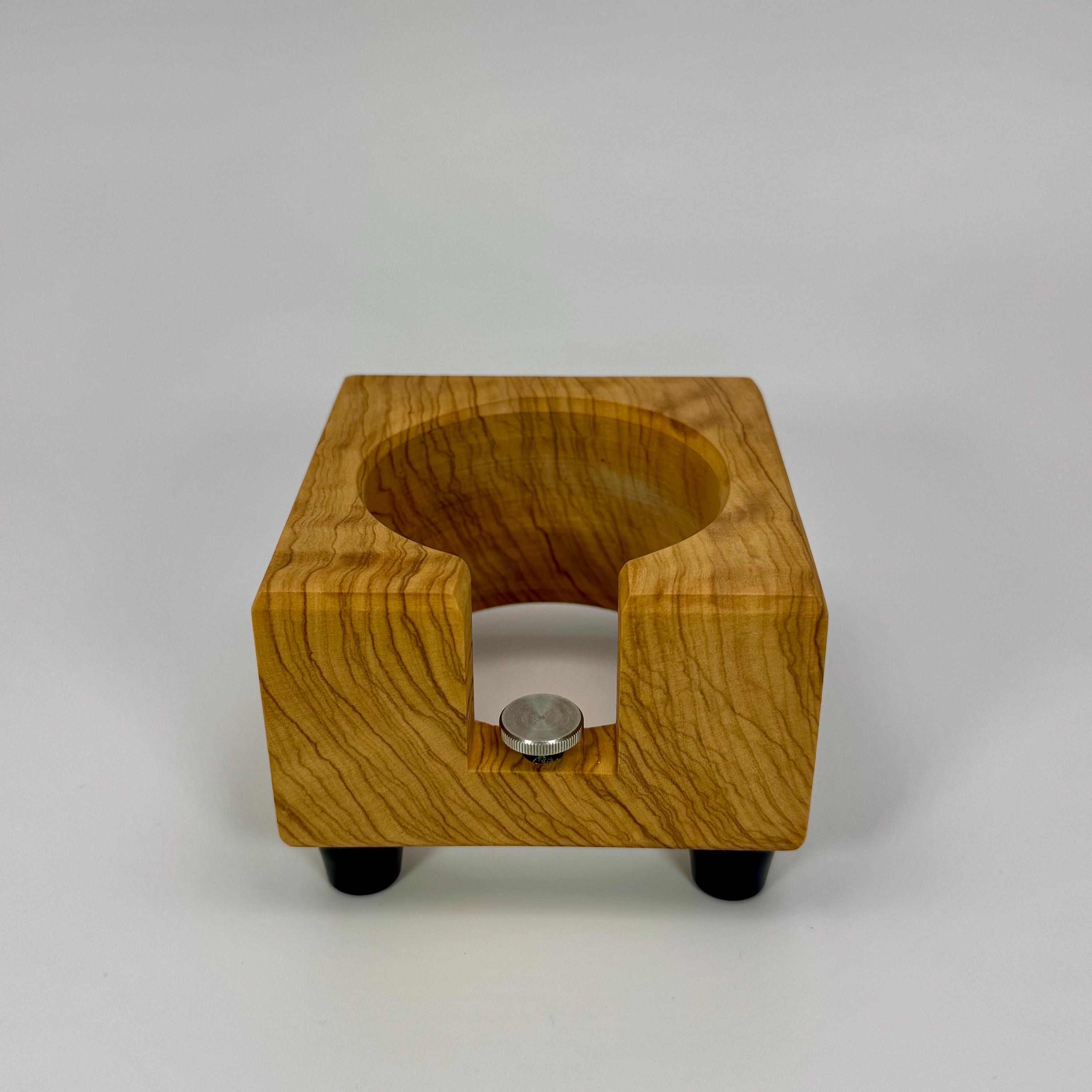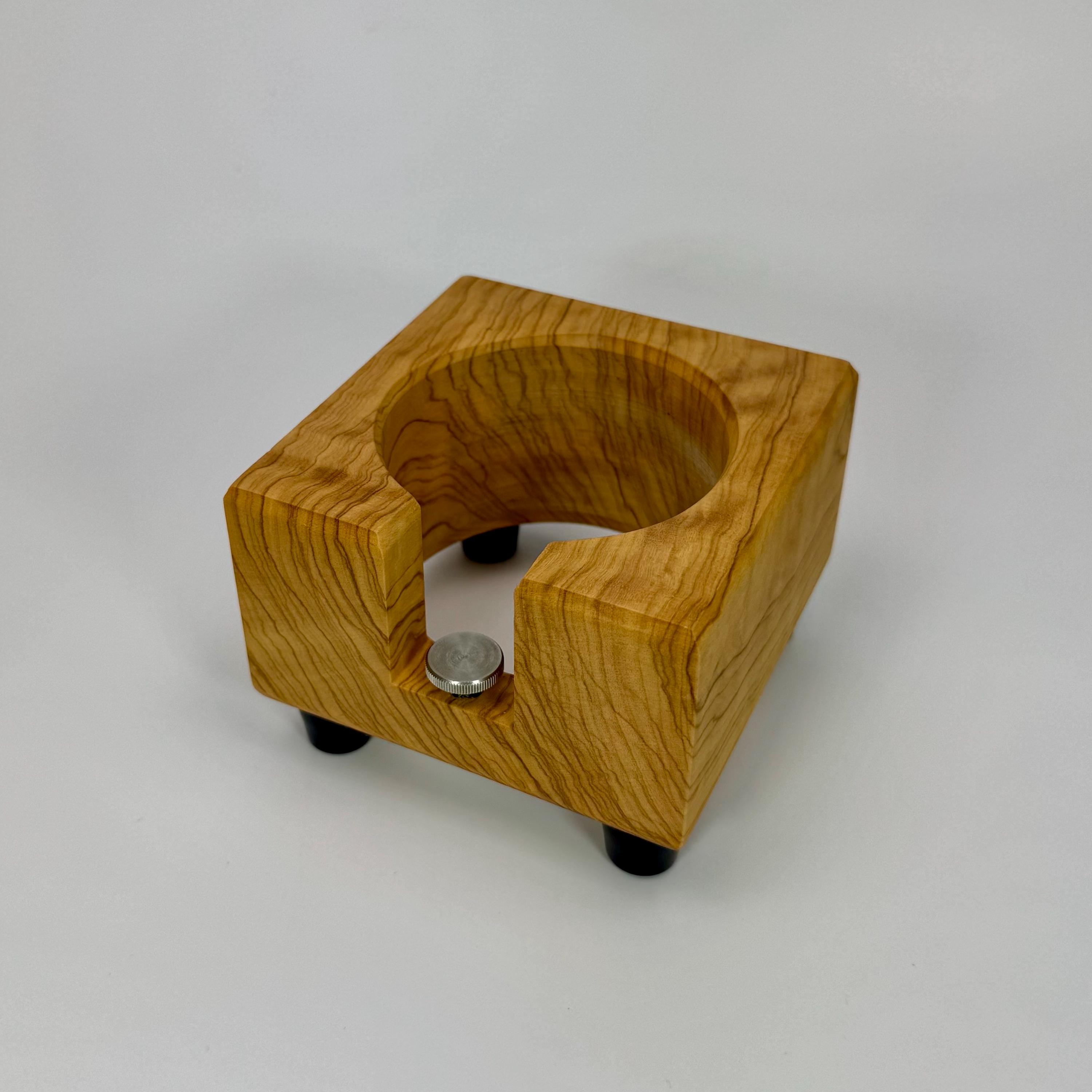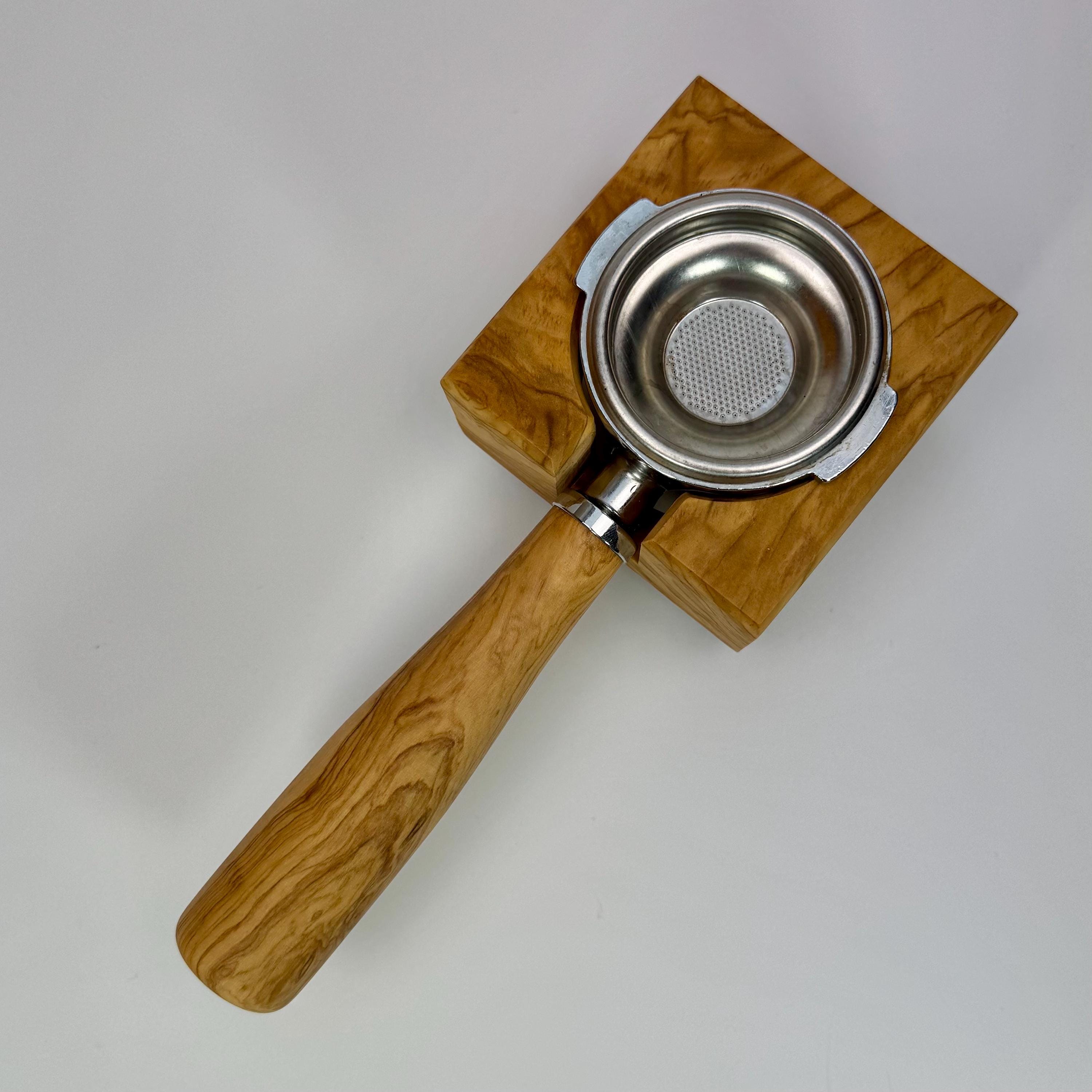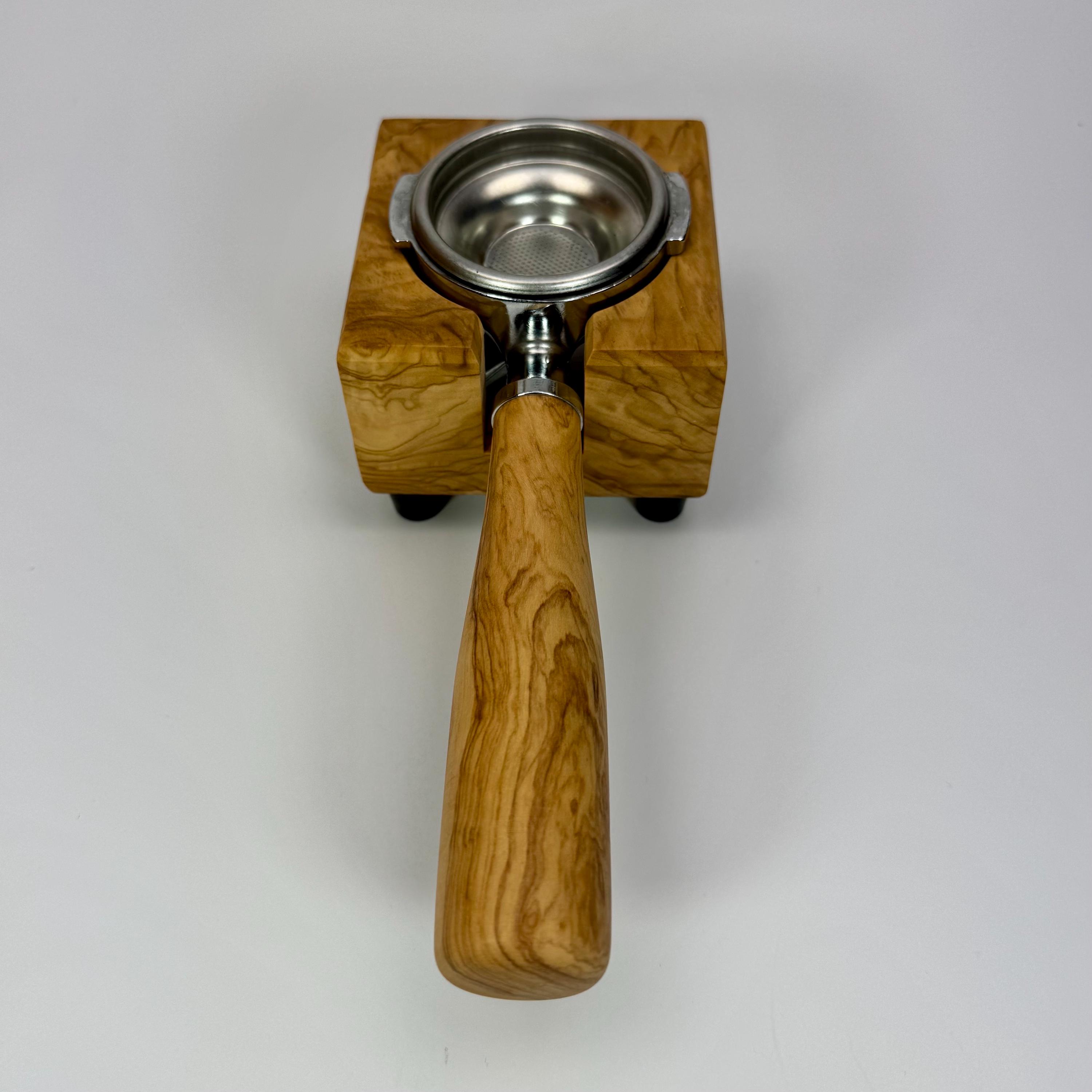 Diese handgefertigte Tampstation aus Olivenholz ist eine funktionale und hochwertige Lösung zur sicheren Ablage deines Siebträgers und bringt Ordnung in deinen Espresso-Workflow.