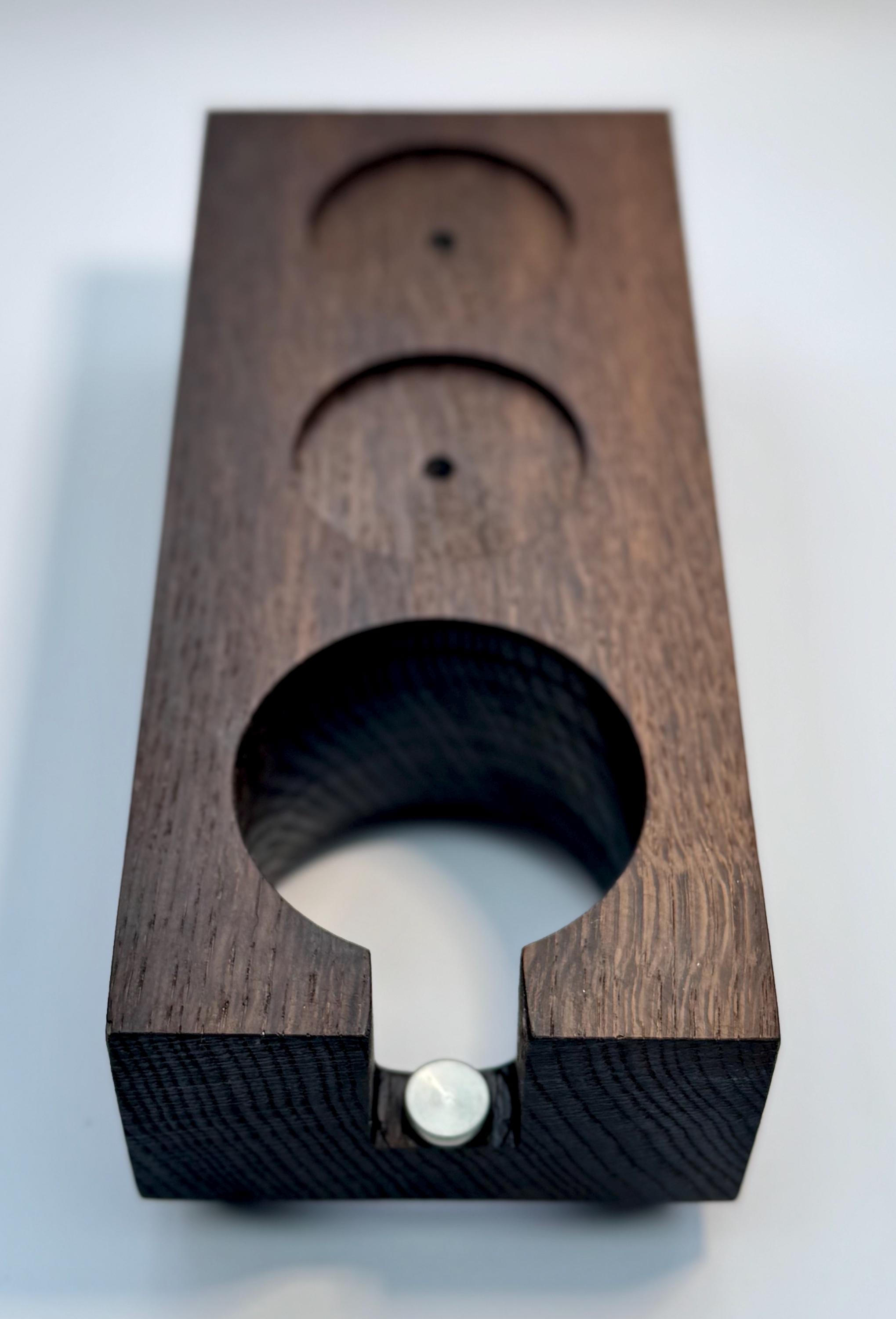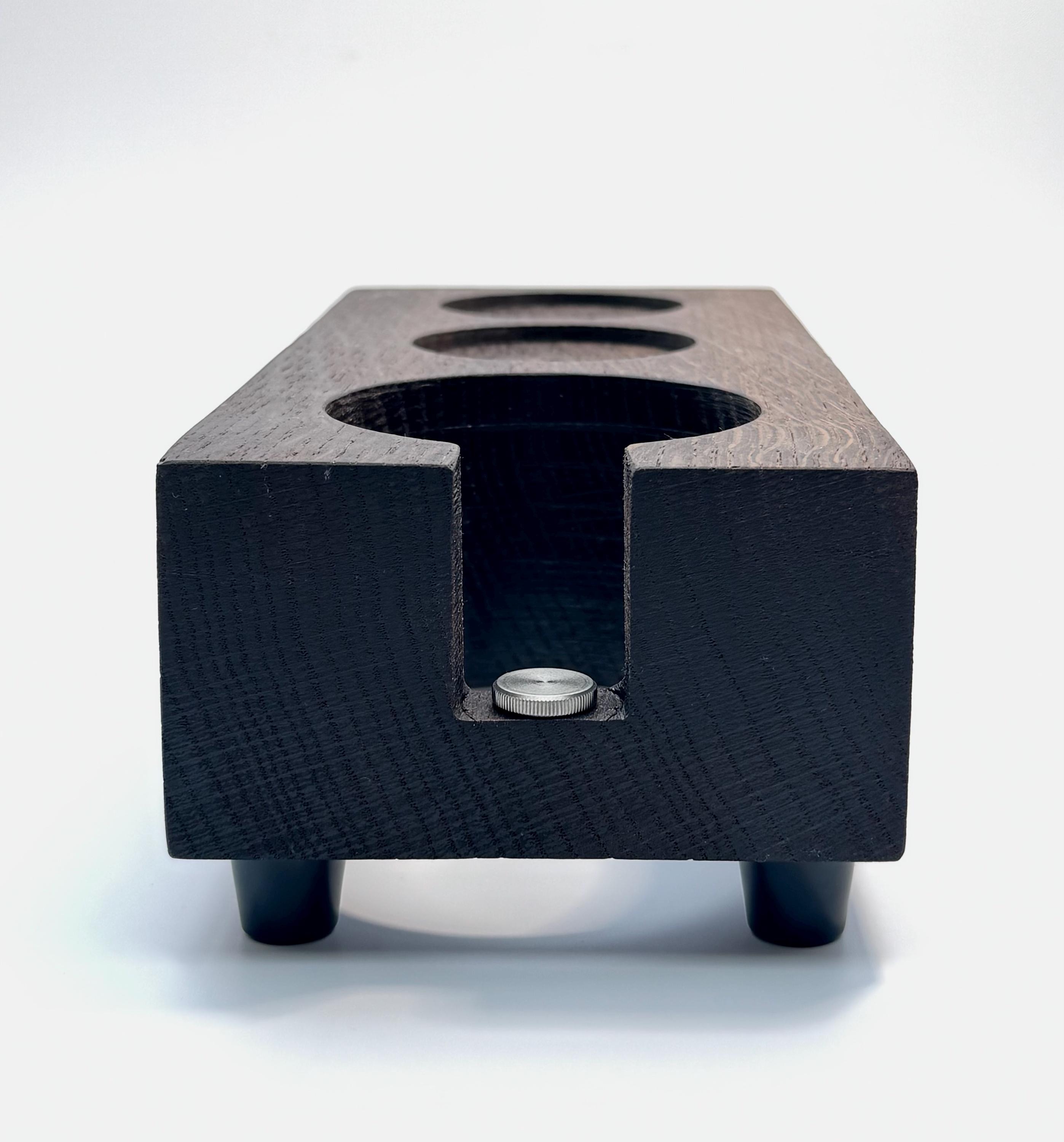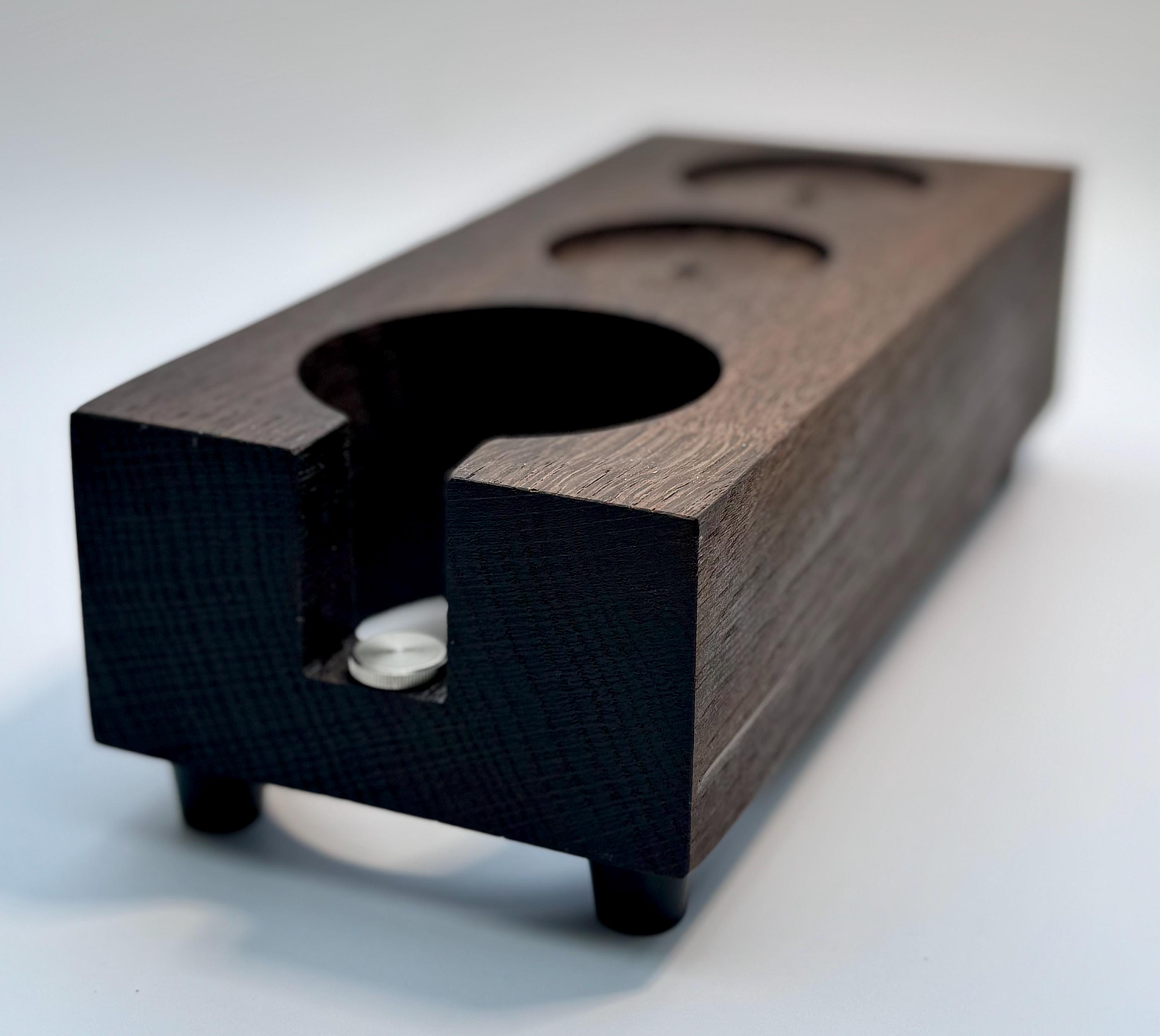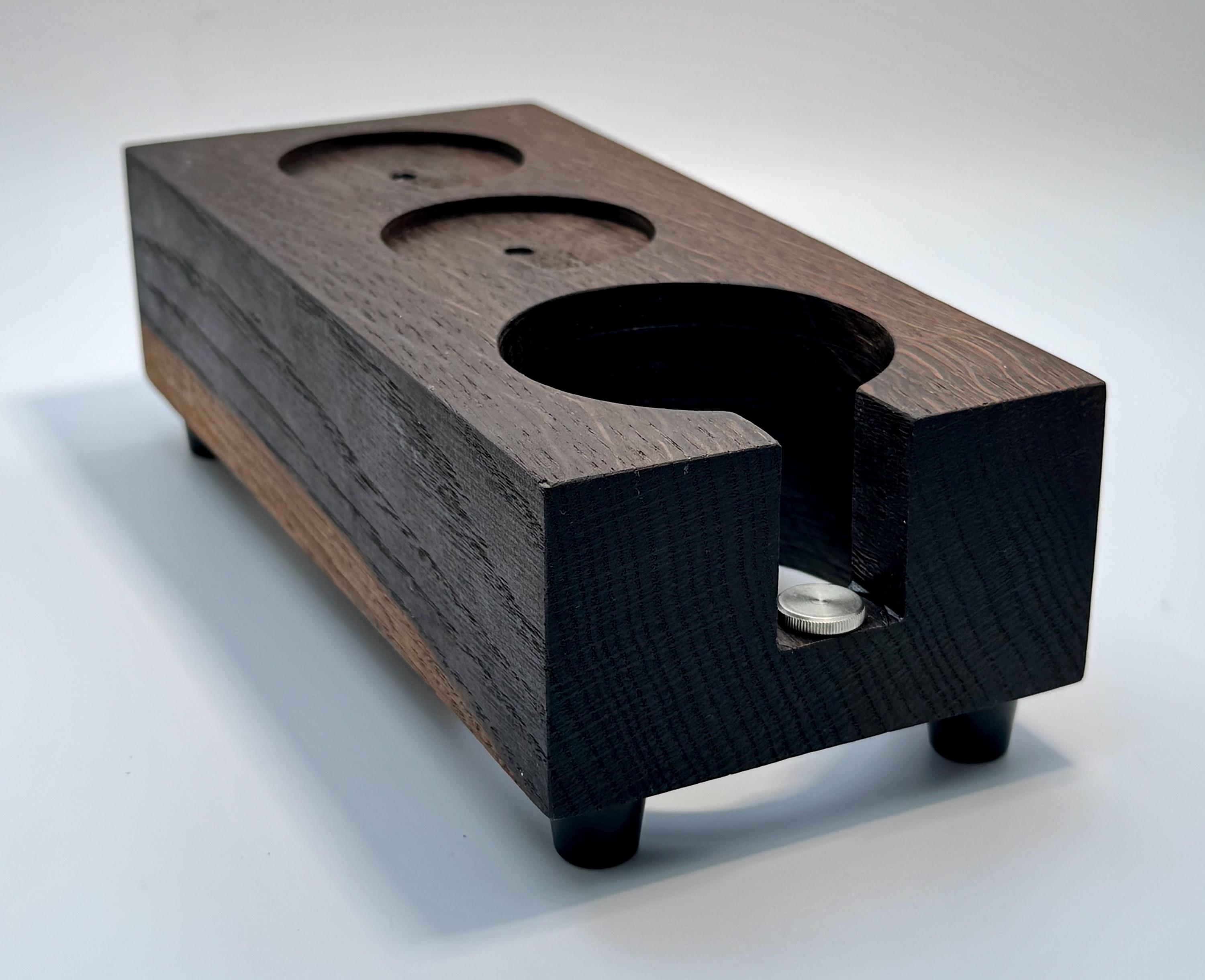 Die Tamperstation besitzt zwei Tamperablagen mit ~60mm Durchmesser. Somit passen die Tamper für die gängigsten Maschinen mit 58mm oder 58,4mm perfekt in die Ablage. Dein Tool (z.b. Leveler / Distributor) ist in der zweiten Ablage ebenfalls perfekt aufgeräumt. Die Bohrung für den Siebträger besitzt einen Durchmesser von ~75mm. Der Siebträger lässt sich dadurch sicher ablegen und kann somit beim Tampen nicht mehr verrutschen. E61 Siebträger sitzen zum Beispiel sehr gut! Bitte überprüfe unbedingt vor Kauf, ob deine Siebträger in die Station passen - gerne unterstütze ich dich dabei, schreibe mir dazu einfach eine kurze Nachricht. Die Tampstation hat eine Höhe von ~6 cm zuzüglich Gummifüße. Zusätzlich habe ich eine einstellbare Auflage für den Siebträgergriff integriert. Dadurch lässt sich die Station noch universeller an verschiedene Siebträger anpassen.