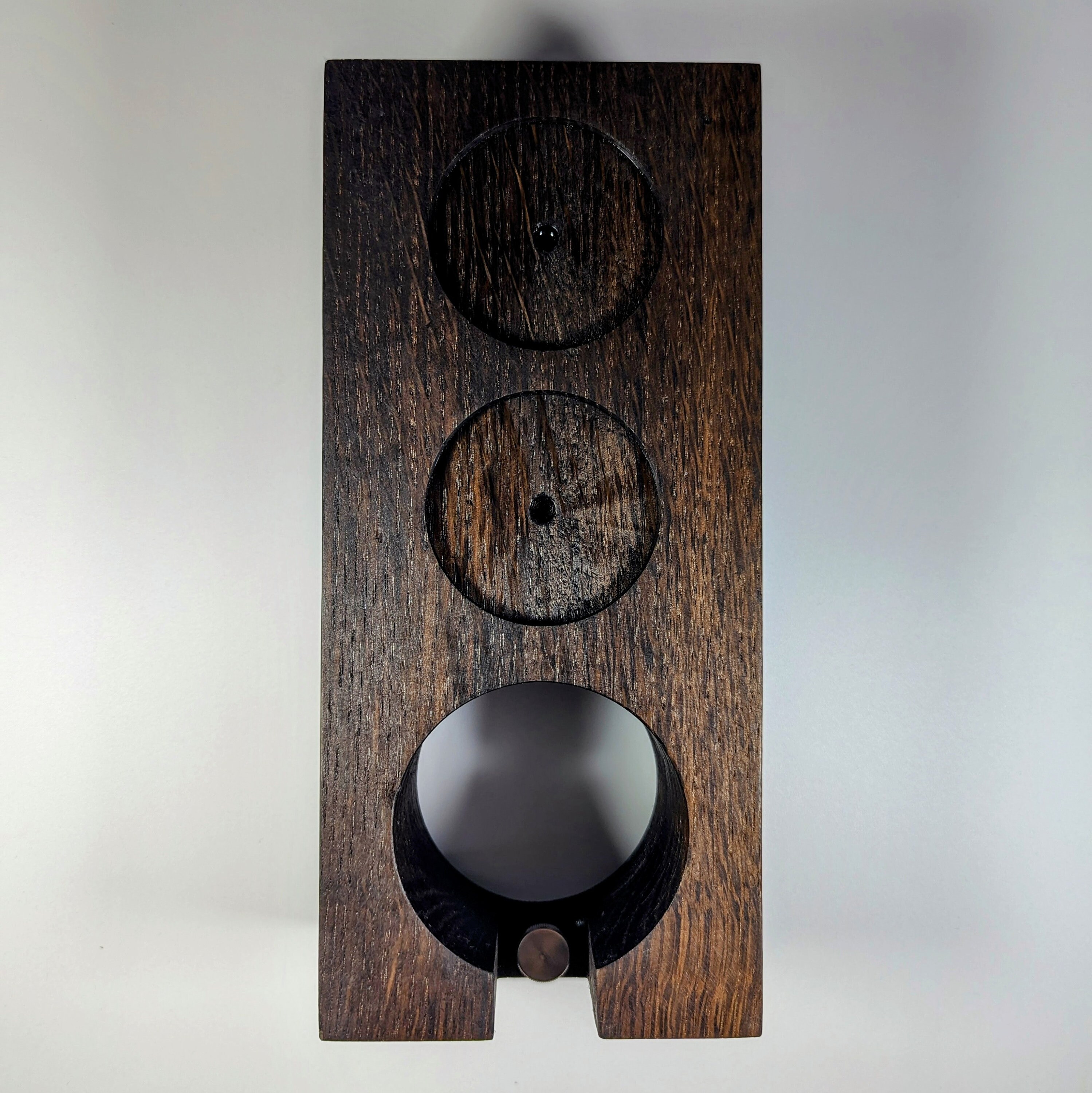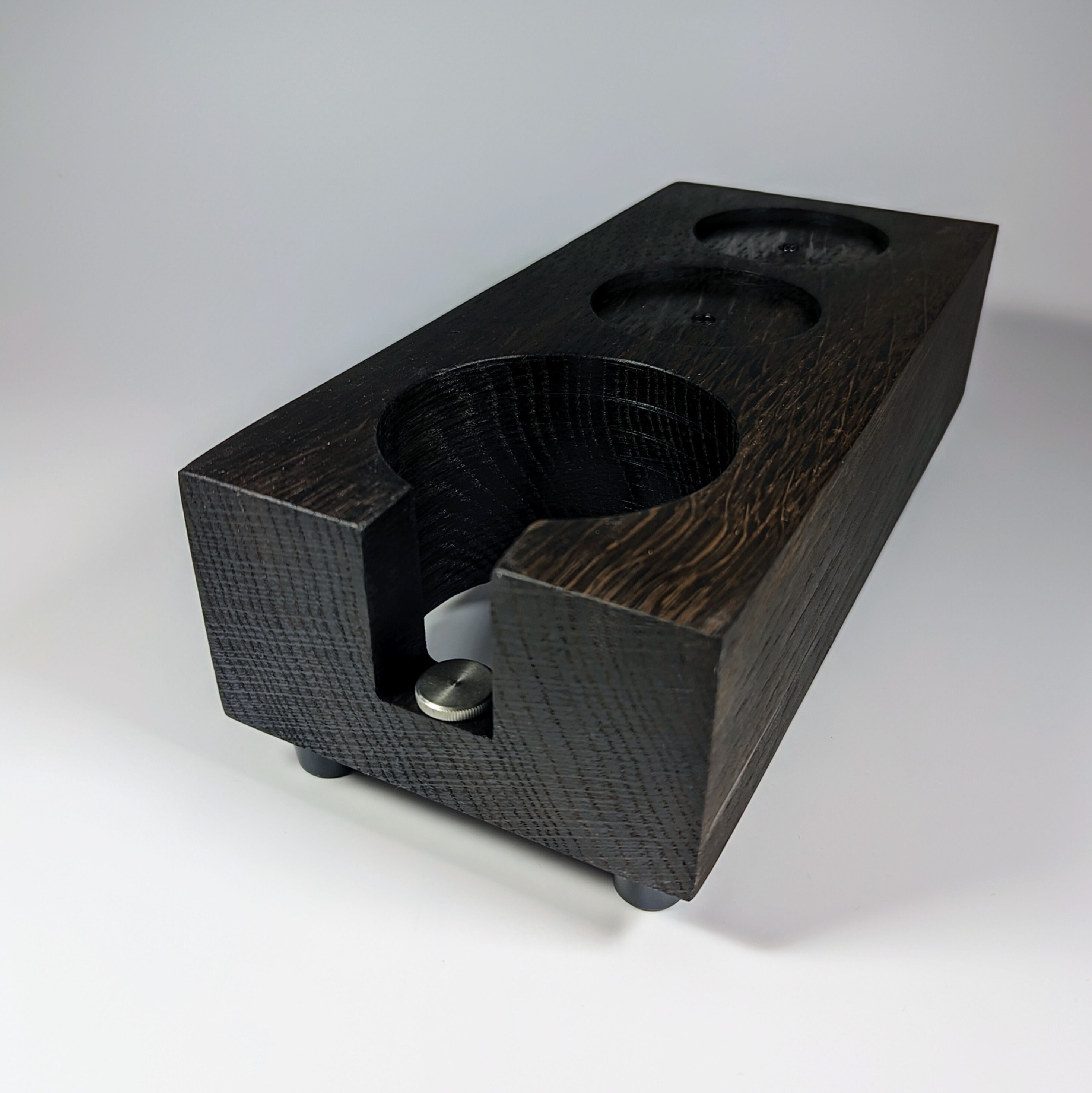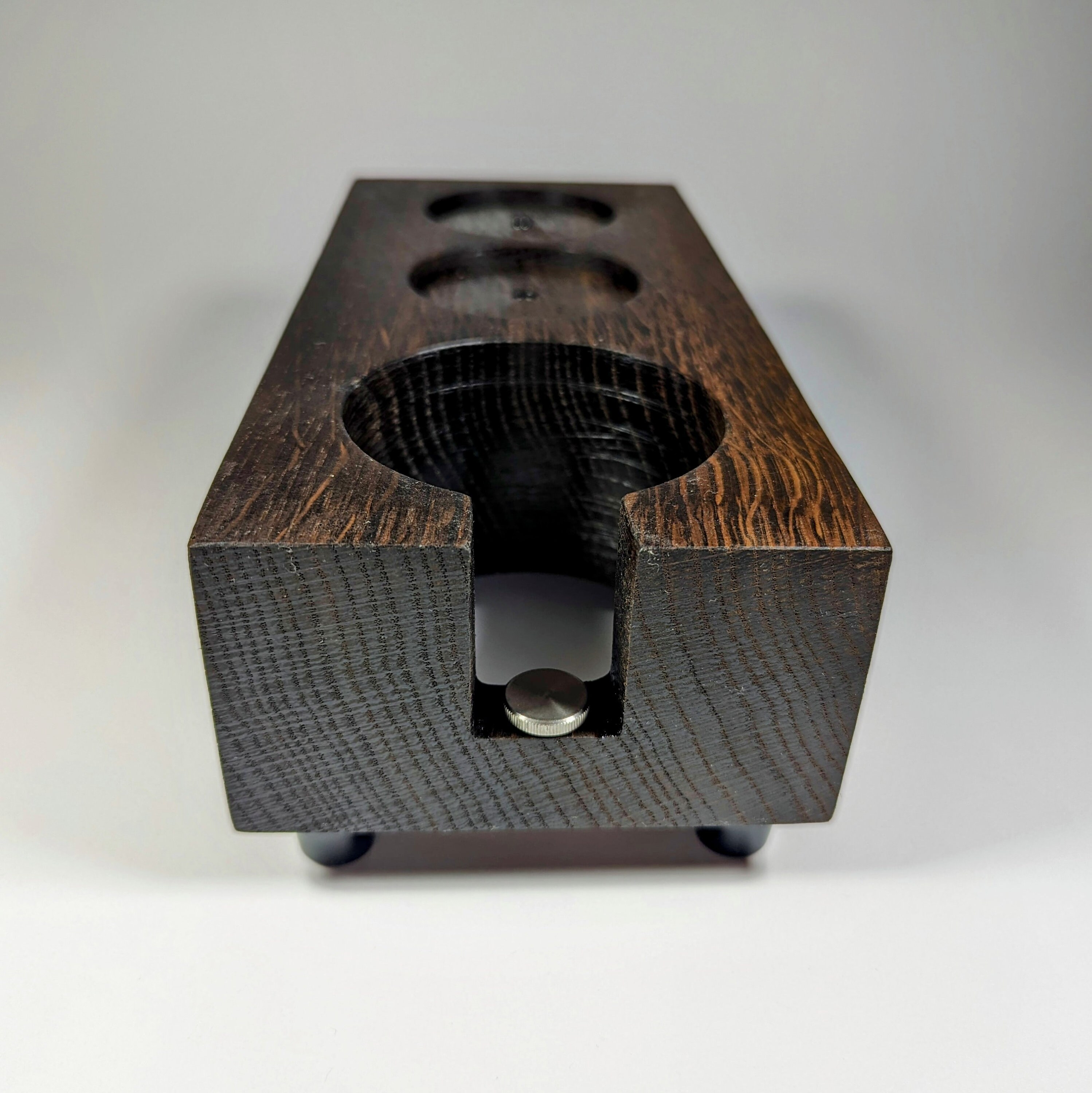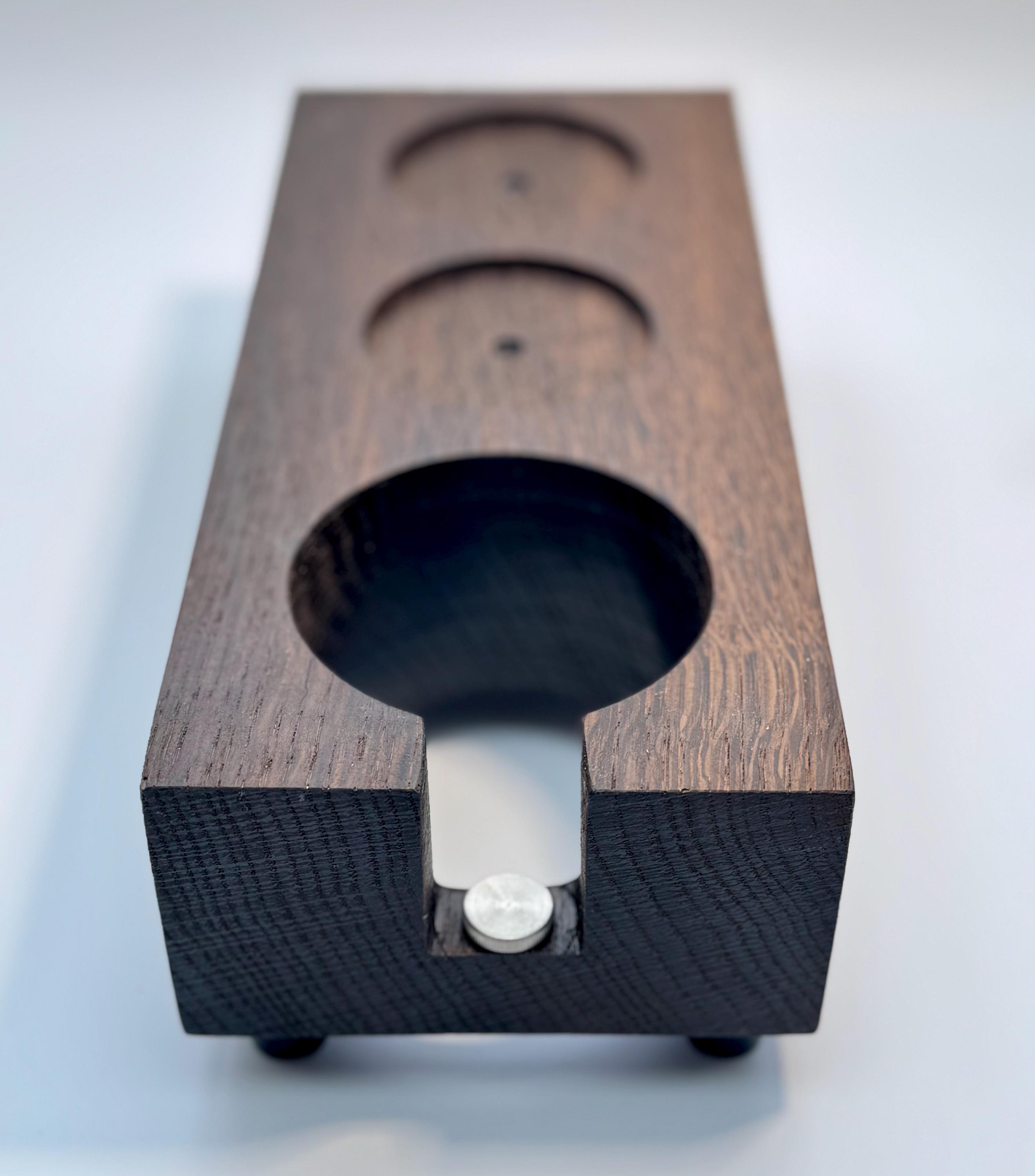 Die Tamperstation besitzt zwei Tamperablagen mit ~60mm Durchmesser. Somit passen die Tamper für die gängigsten Maschinen mit 58mm oder 58,4mm perfekt in die Ablage. Dein Tool (z.b. Leveler / Distributor) ist in der zweiten Ablage ebenfalls perfekt aufgeräumt. Die Bohrung für den Siebträger besitzt einen Durchmesser von ~75mm. Der Siebträger lässt sich dadurch sicher ablegen und kann somit beim Tampen nicht mehr verrutschen. E61 Siebträger sitzen zum Beispiel sehr gut! Bitte überprüfe unbedingt vor Kauf, ob deine Siebträger in die Station passen - gerne unterstütze ich dich dabei, schreibe mir dazu einfach eine kurze Nachricht. Die Tampstation hat eine Höhe von ~6 cm zuzüglich Gummifüße. Zusätzlich habe ich eine einstellbare Auflage für den Siebträgergriff integriert. Dadurch lässt sich die Station noch universeller an verschiedene Siebträger anpassen.
