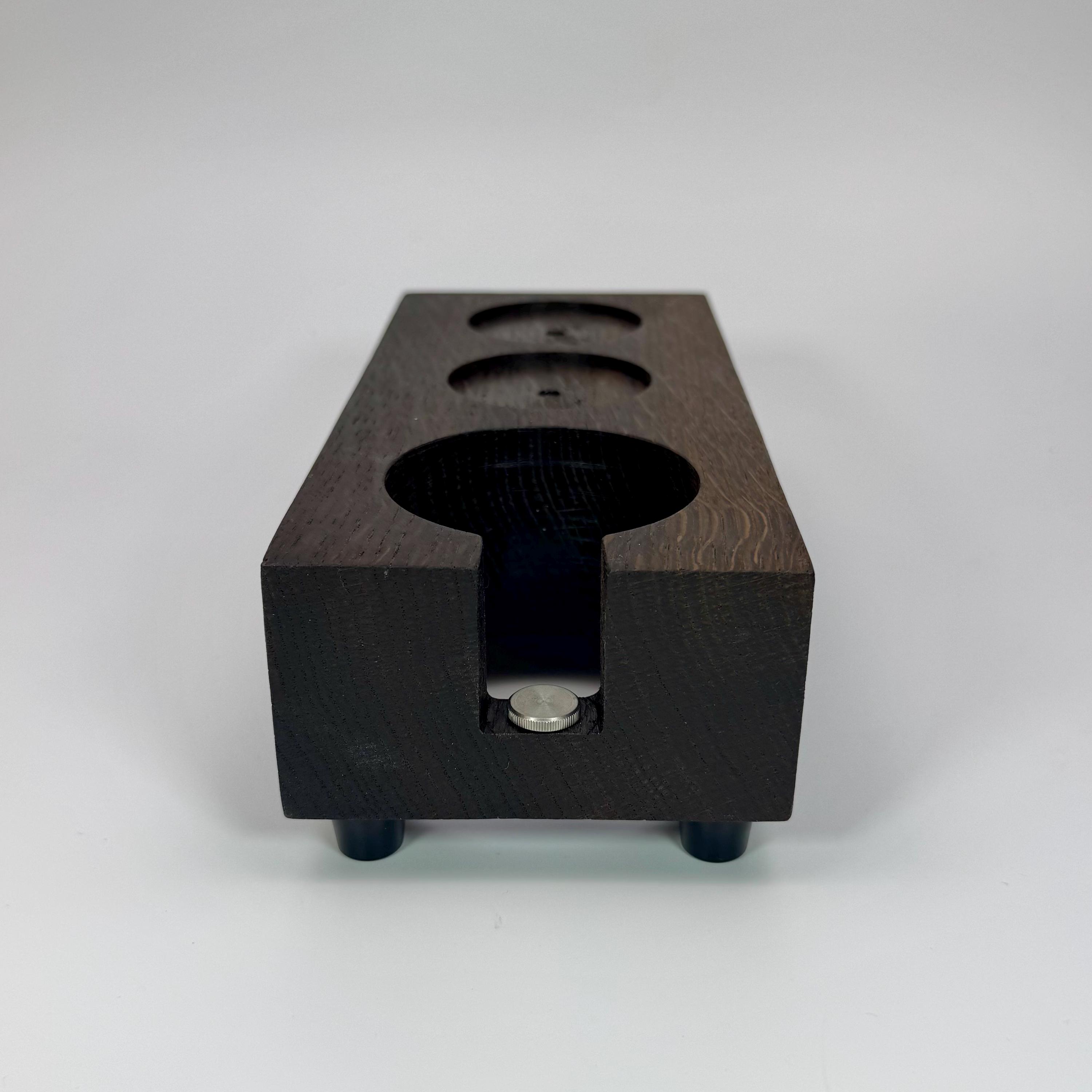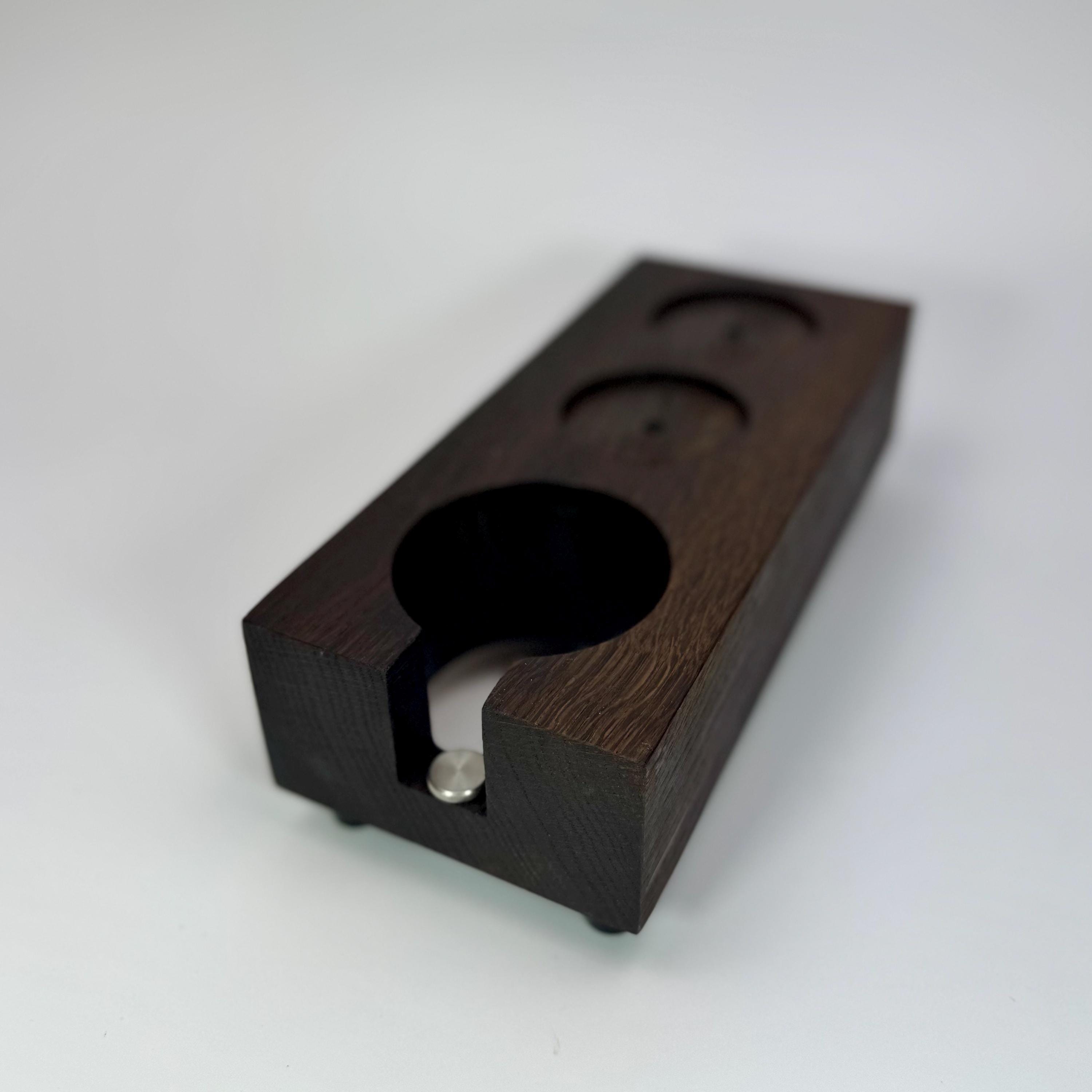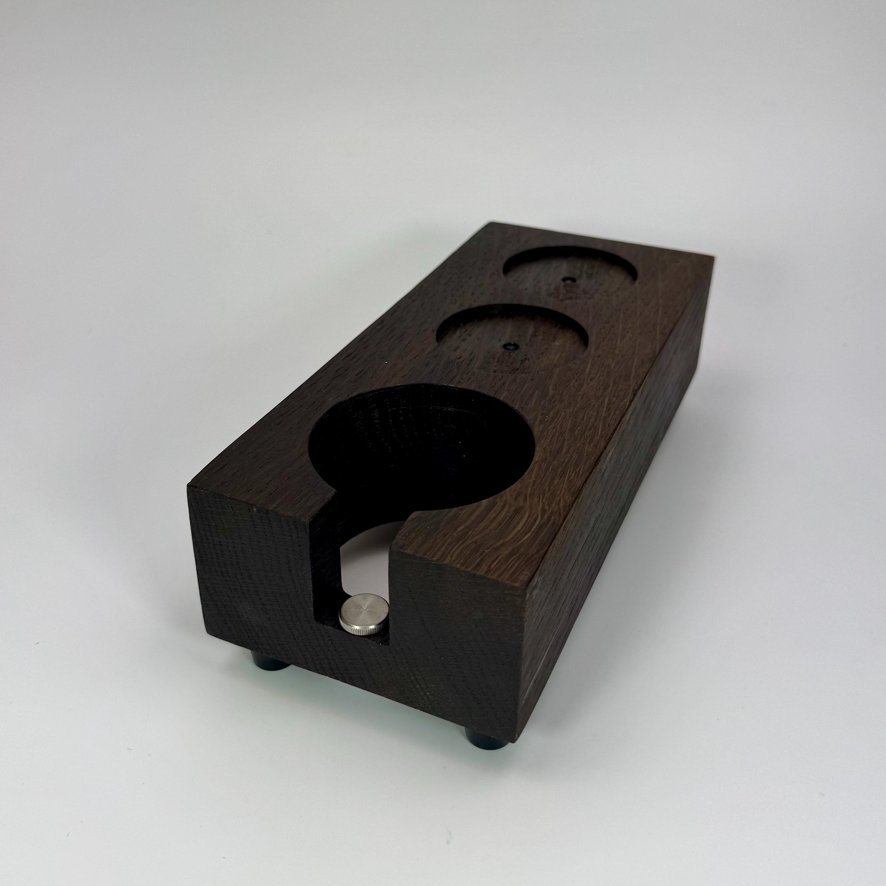 Diese handgefertigte Tampstation aus Räuchereiche ist die erweiterte Version meiner Tampstation-Serie und bietet neben der sicheren Ablage für deinen Siebträger zwei zusätzliche Ablagen – ideal für Tamper und weiteres Barista-Zubehör.
