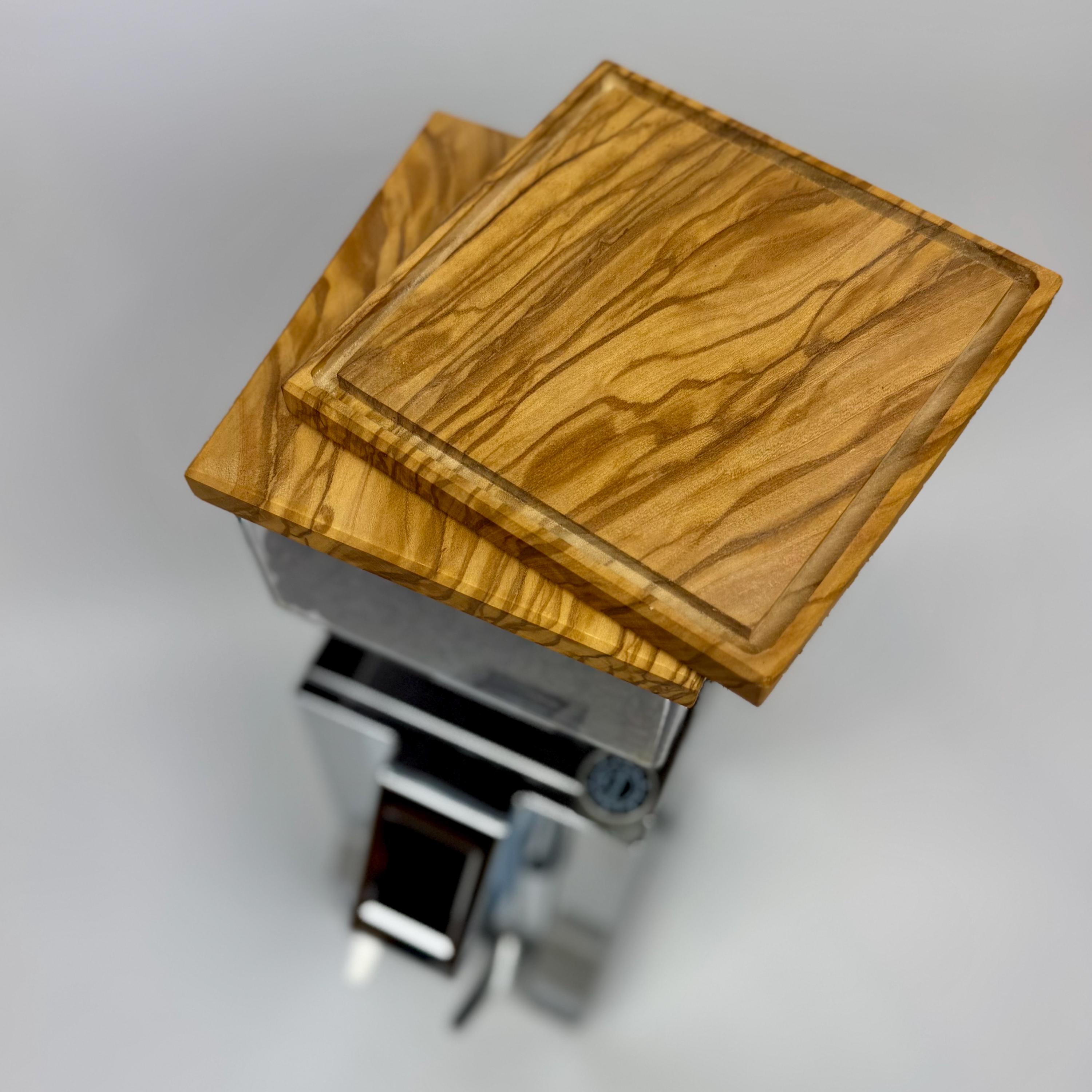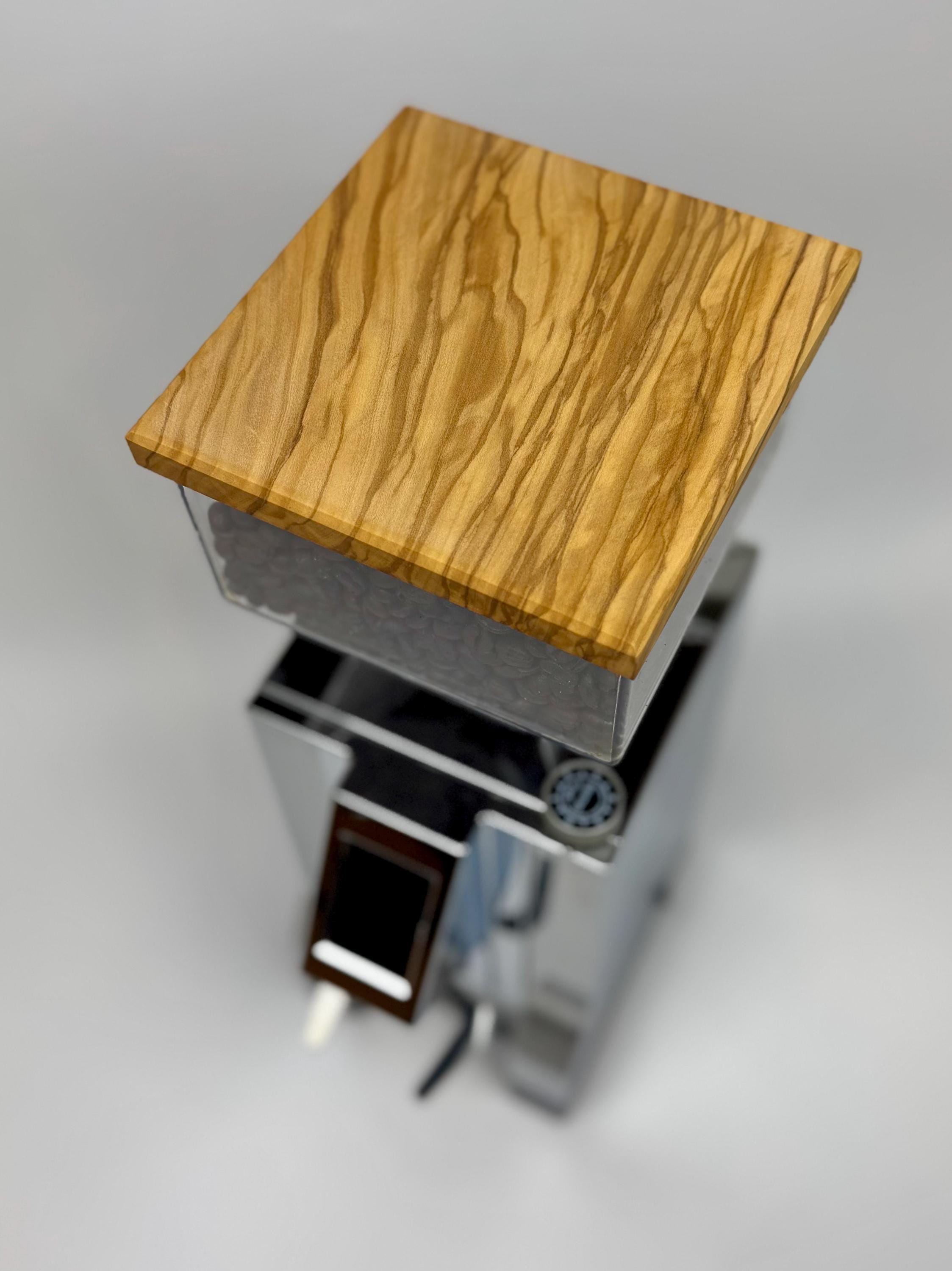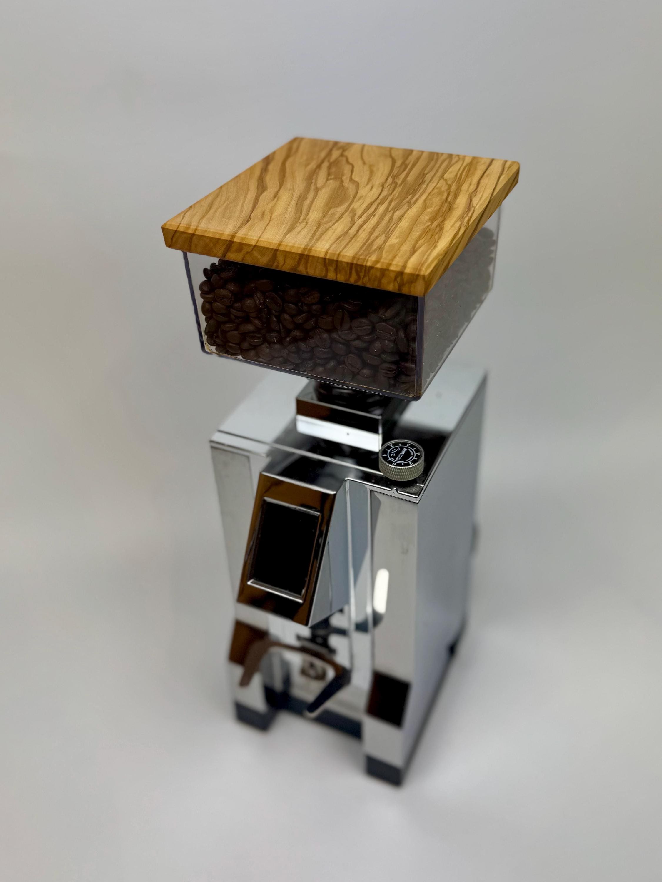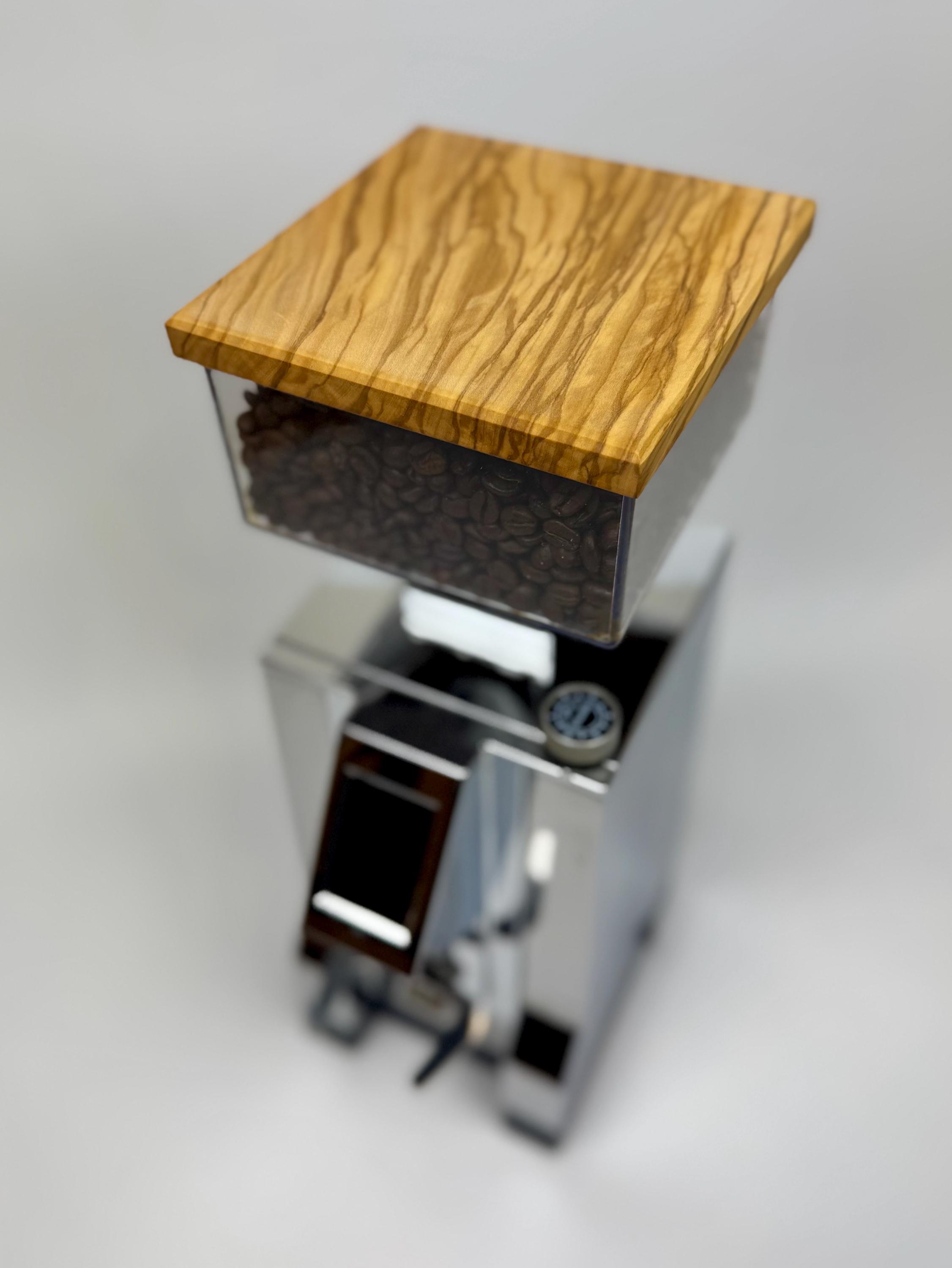 Mit diesem handgefertigten Mühlendeckel aus Olivenholz erhält deine Eureka „New Mignon“ ein stilvolles Upgrade, das perfekt in jeden Home-Barista-Arbeitsplatz passt.